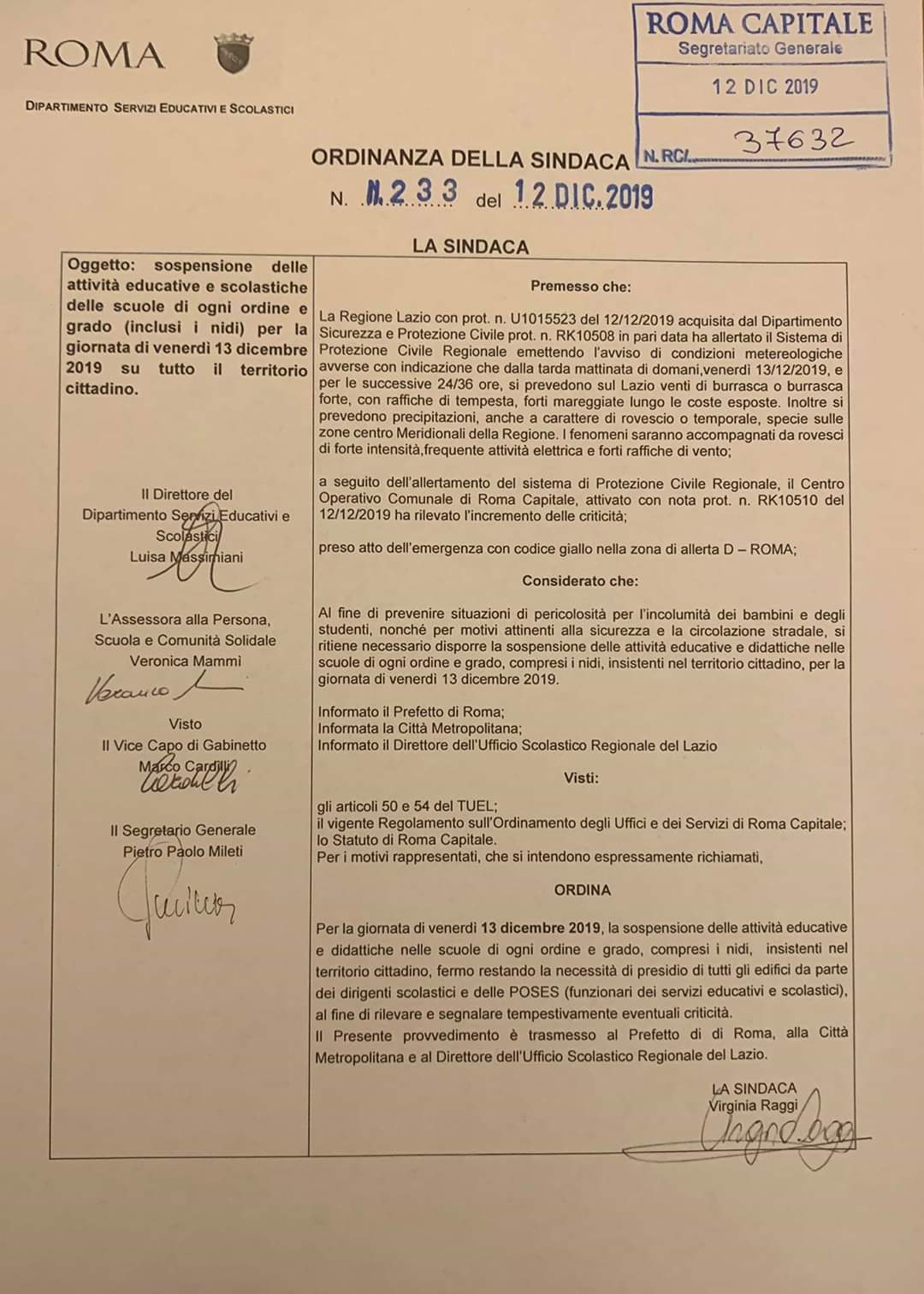 domani, 13 Dicembre 2019, le scuole a Roma, di ogni ordine e grado, rimarranno chiuse. Come da ORDINANZA della Sindaca Raggi.