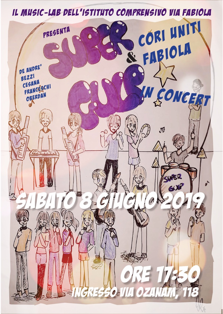 Alle ore 17.30 presso la Scuola Media De Andrè, in via Fabiola, concerto SUPERGULP e i cori uniti Fabiola (De Andrè, Bezzi, Cesana, Oberdan e Franceschi).