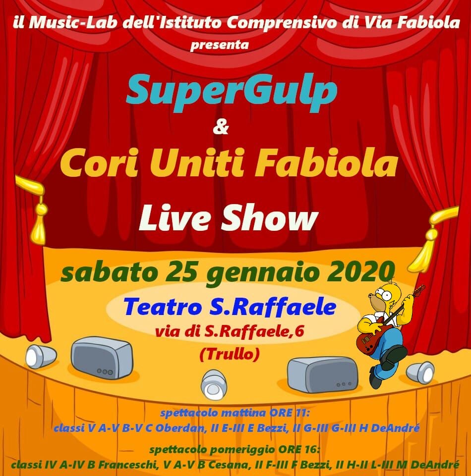 Sabato 25 Gennaio 2020 presso il Teatro di San Raffaele in Via di San Raffaele 6 (TRULLO) il MUSIC-LAB dell’I.C. Via Fabiola presenta “ CORI UNITI VIA FABIOLA e SUPERGULP in CONCERTO”